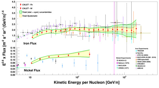 CALETによる鉄とニッケルの観測結果と、他の観測結果との比較。エネルギーが大きくなるにつれ急激に少なくなるスペクトルの構造を調べるため、図の縦軸にはエネルギーの2.6乗が積算されている。