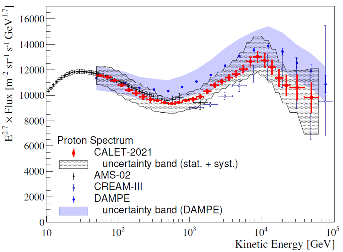 CALETによる陽子の観測結果と、他実験の観測との比較。エネルギーが大きくなるにつれ急激に少なくなるスペクトルの構造を調べるため、図の縦軸にはエネルギーの2.7乗が積算されている。