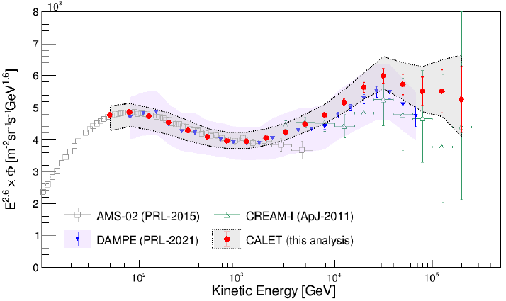 CALETによるヘリウムの観測結果と、他実験の観測との比較。エネルギーが大きくなるにつれ急激に少なくなるスペクトルの構造を調べるため、図の縦軸にはエネルギーの2.6乗が積算されている。